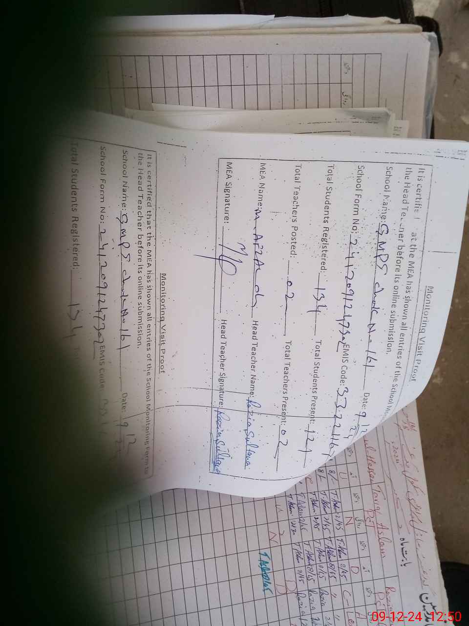 | Attendance Register | Head Teacher | MEA with School | Visit Proof |