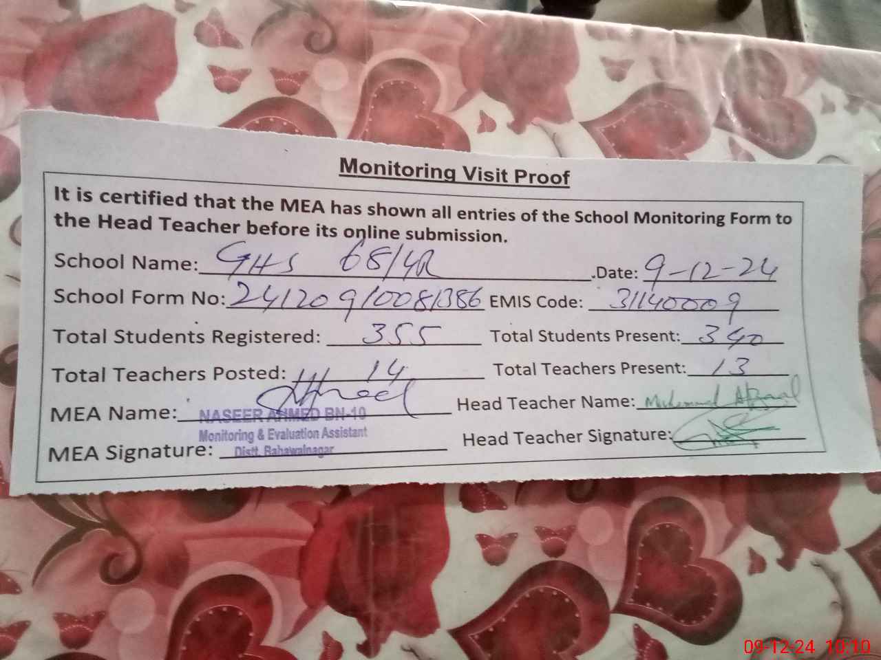 | Attendance Register | Head Teacher | MEA with School | Visit Proof |