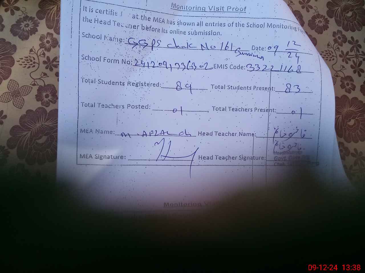 | EMIS Code: 33221168 | Name of School: GGPS CHAK NO 161 JB GUNIANA | |||