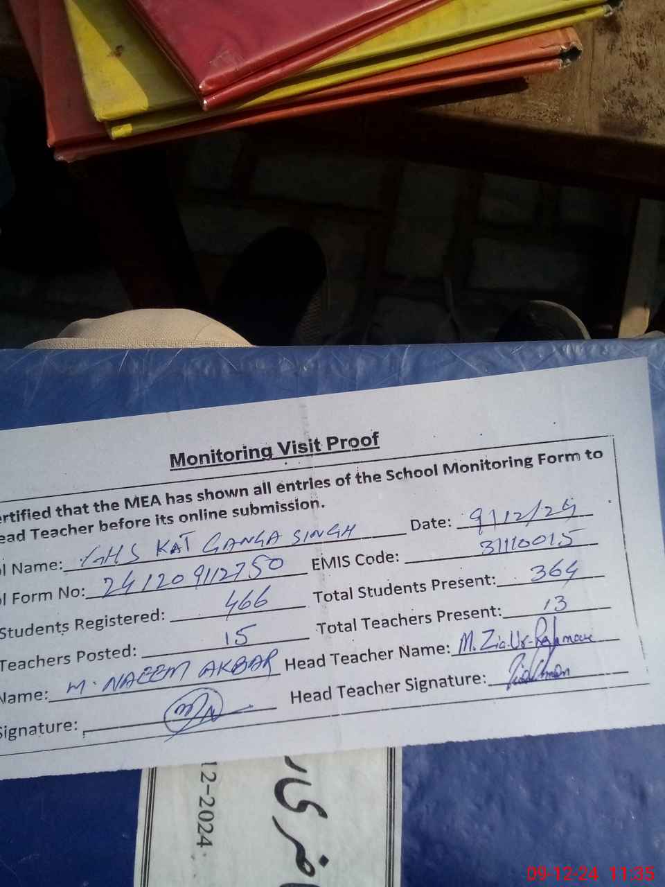 | Attendance Register | Head Teacher | MEA with School | Visit Proof |