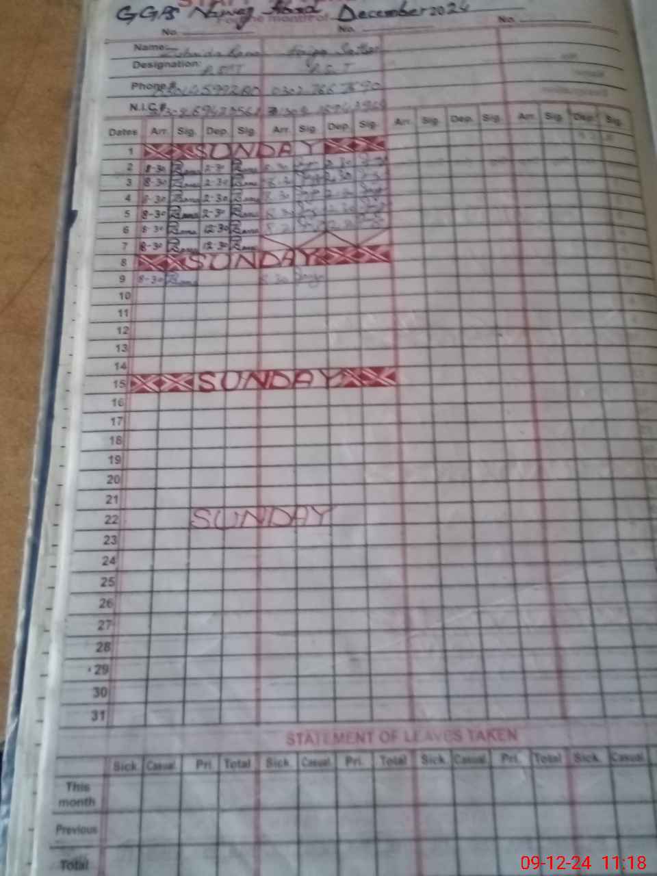 | CNIC | Full Name | Designation | R/C | Absence During Last Calender Month |