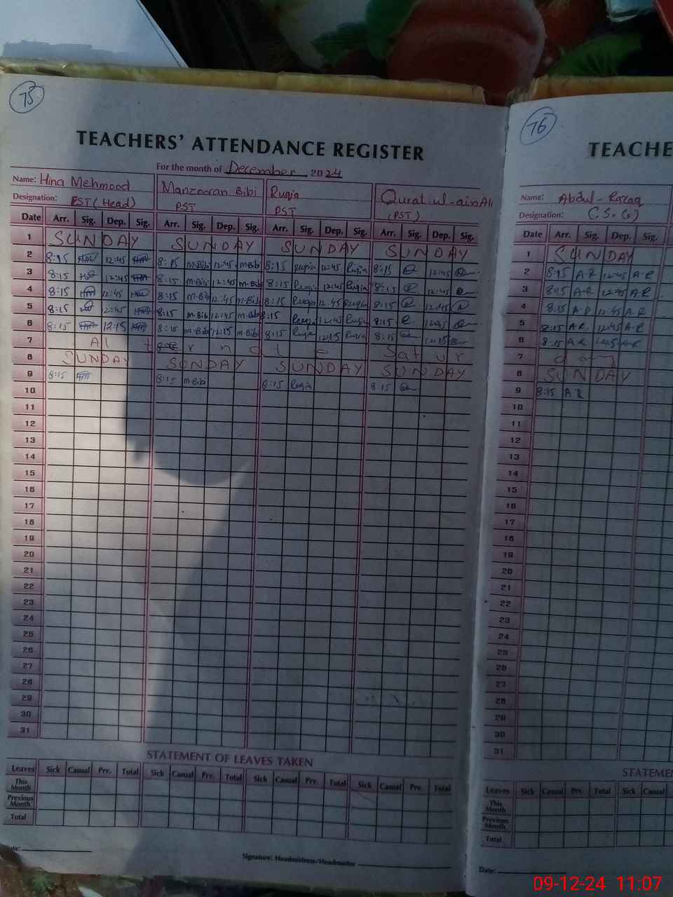 | CNIC | Full Name | Designation | R/C | Absence During Last Calender Month |