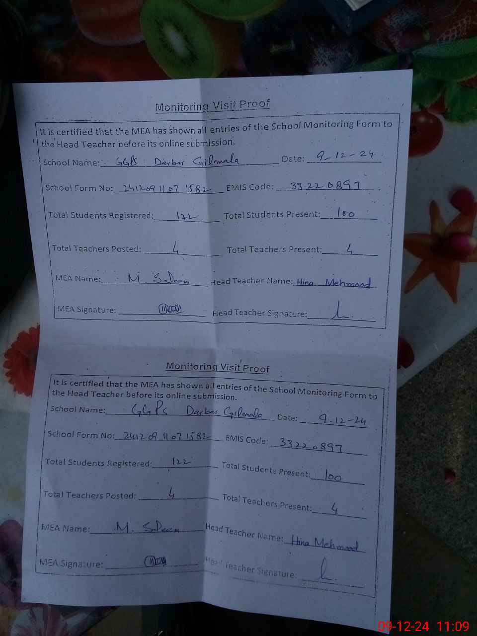 | Attendance Register | Head Teacher | MEA with School | Visit Proof |