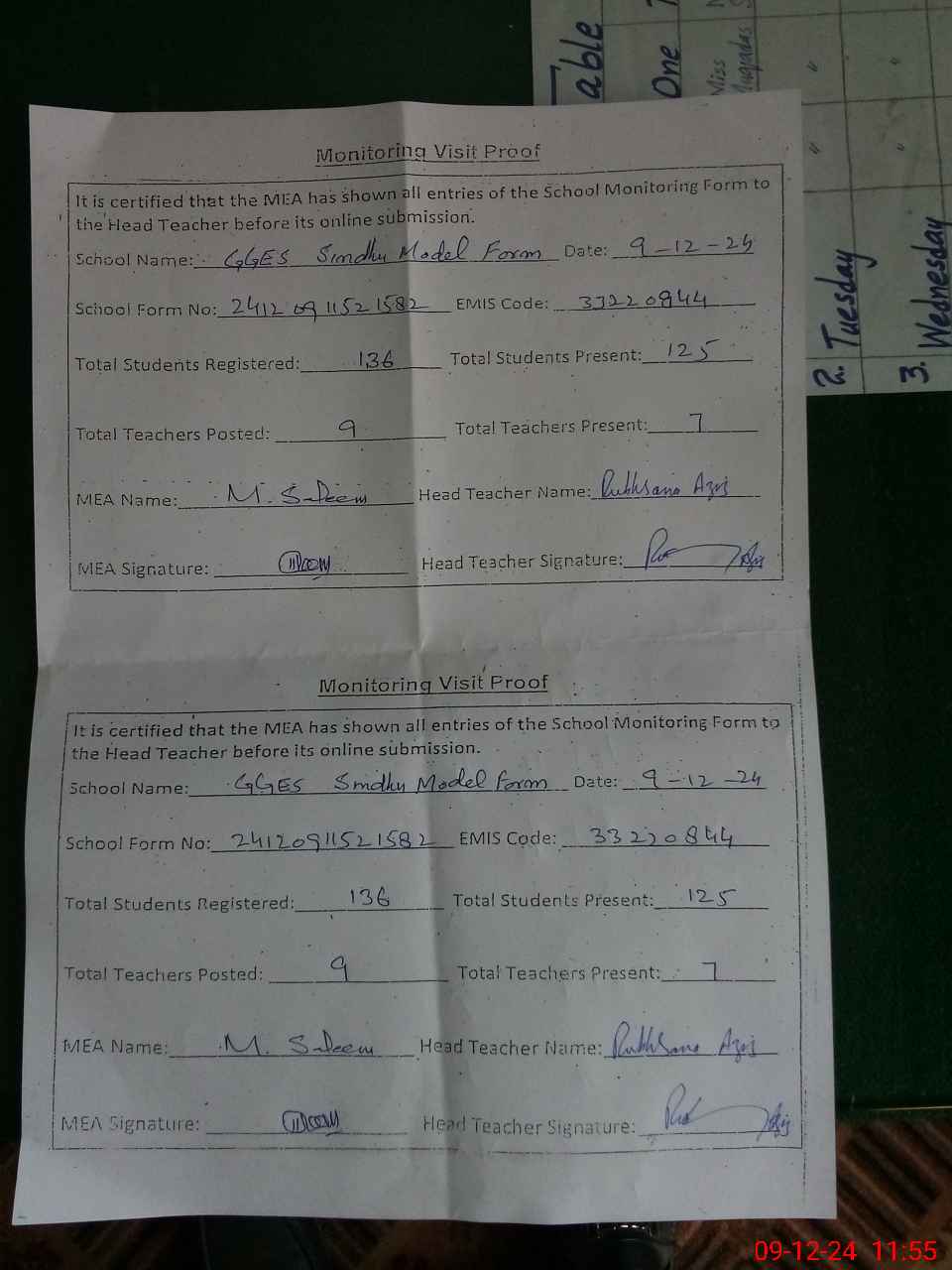 | Attendance Register | Head Teacher | MEA with School | Visit Proof |