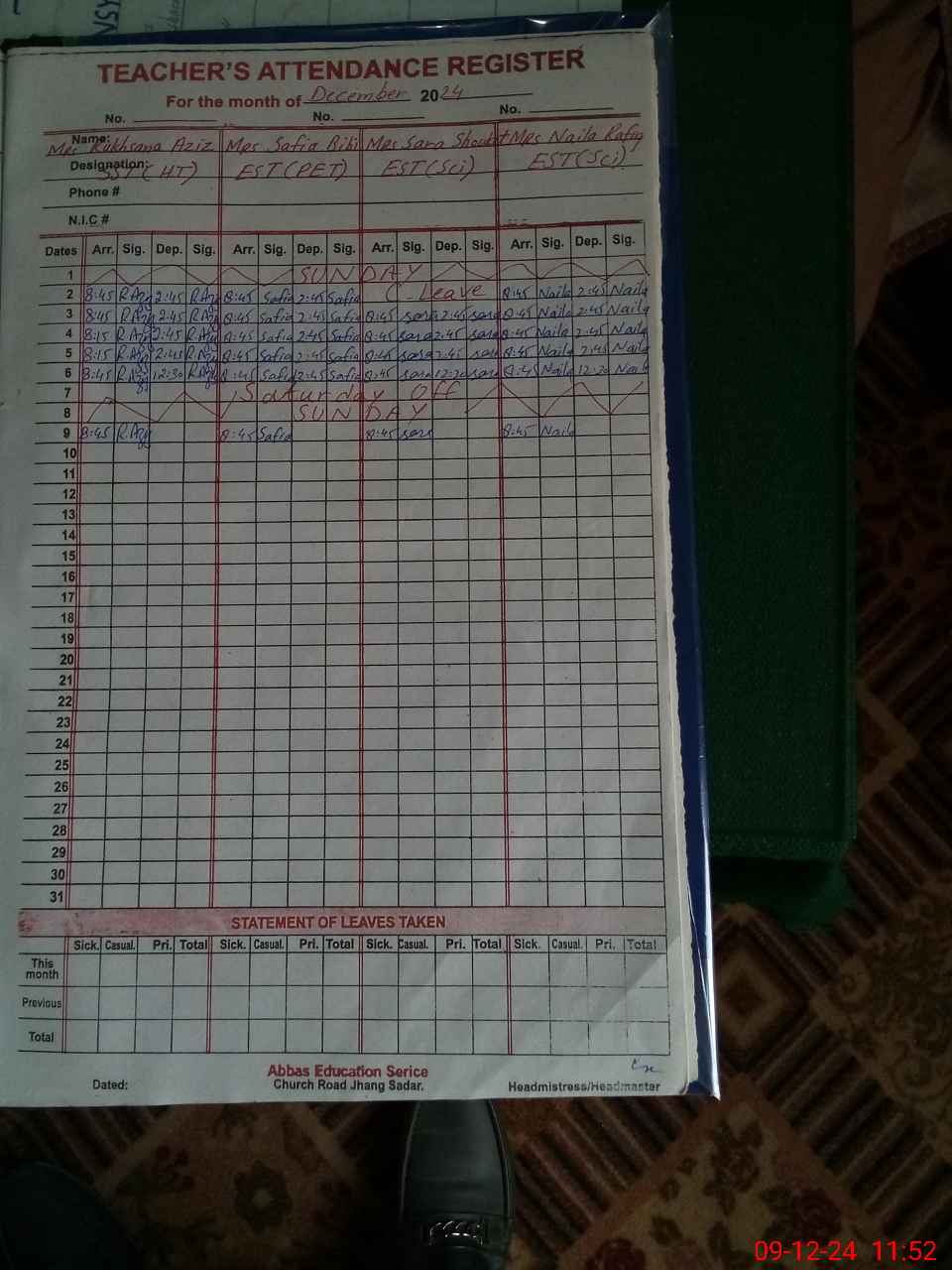 | CNIC | Full Name | Designation | R/C | Absence During Last Calender Month |