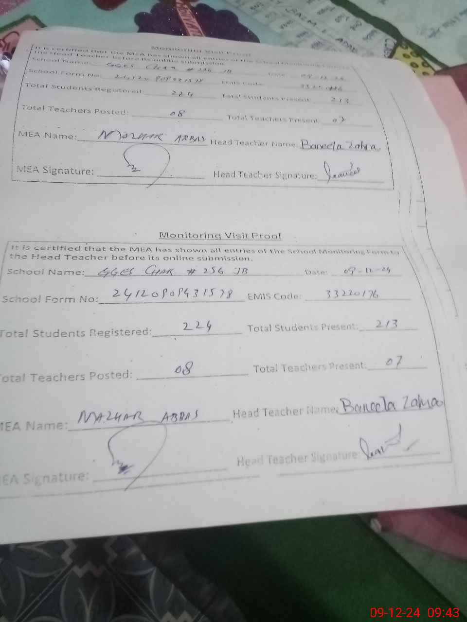 | Attendance Register | Head Teacher | MEA with School | Visit Proof |