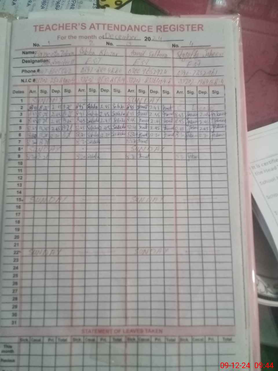 | CNIC | Full Name | Designation | R/C | Absence During Last Calender Month |