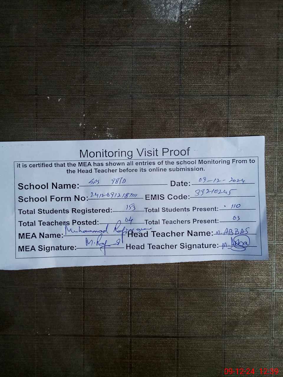 | Attendance Register | Head Teacher | MEA with School | Visit Proof |