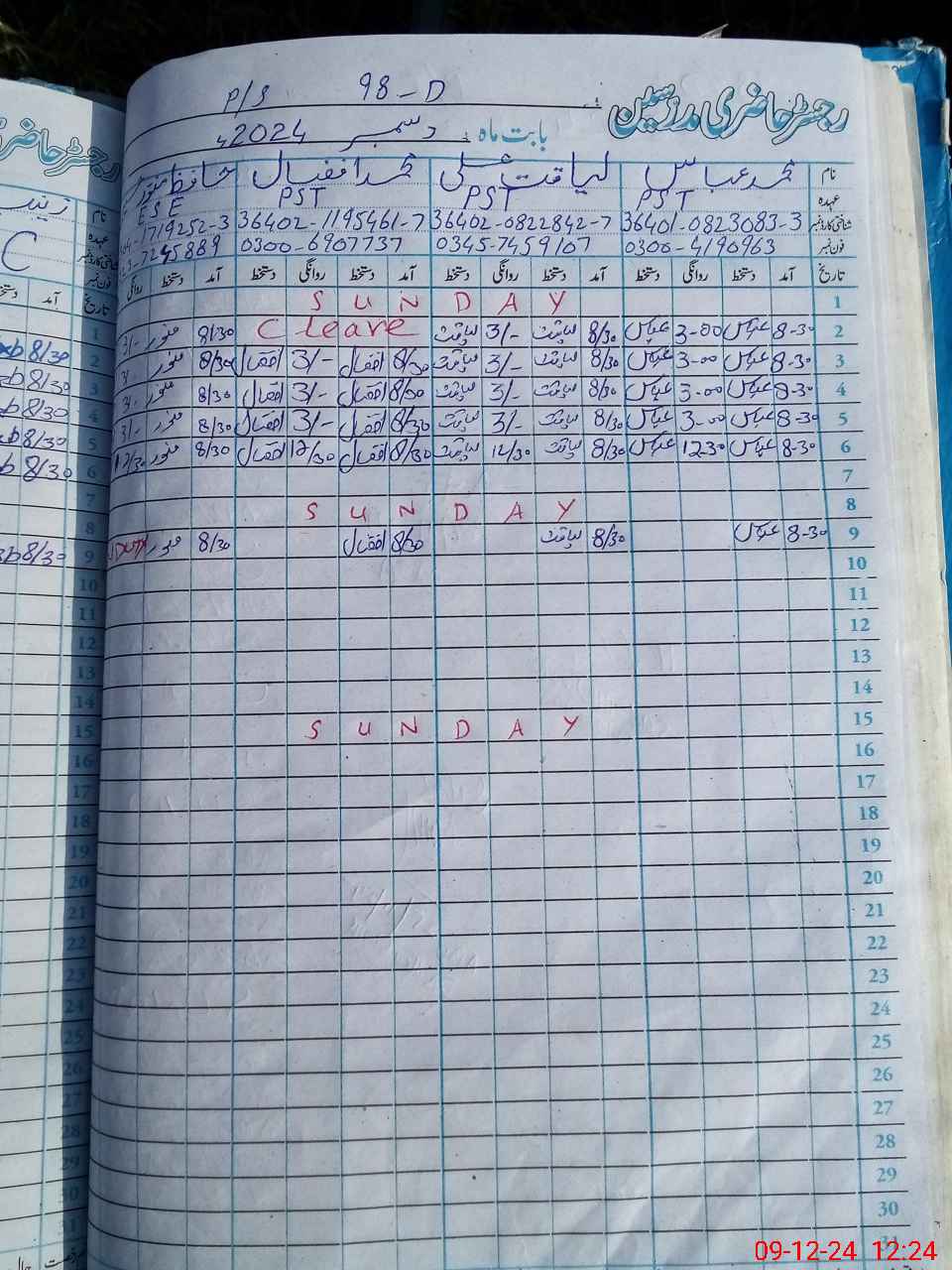 | CNIC | Full Name | Designation | R/C | Absence During Last Calender Month |