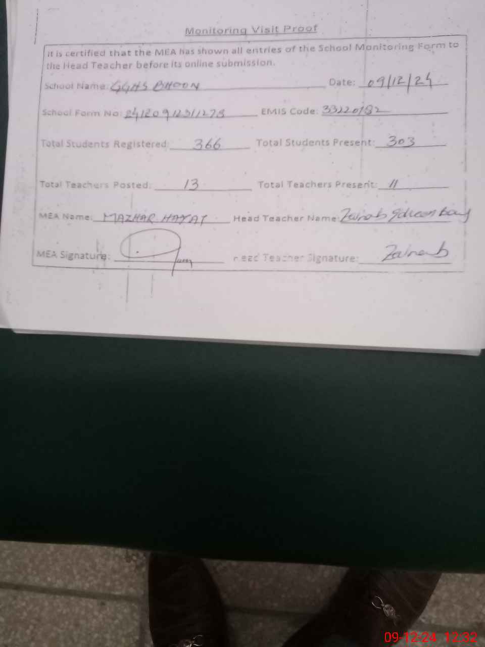 | Attendance Register | Head Teacher | MEA with School | Visit Proof |