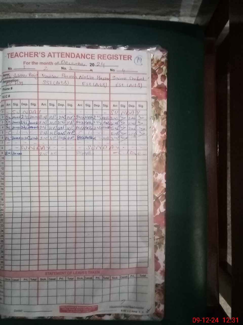 | CNIC | Full Name | Designation | R/C | Absence During Last Calender Month |