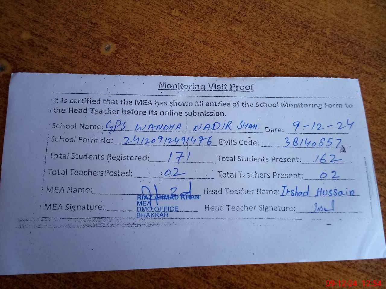 | Attendance Register | Head Teacher | MEA with School | Visit Proof |
