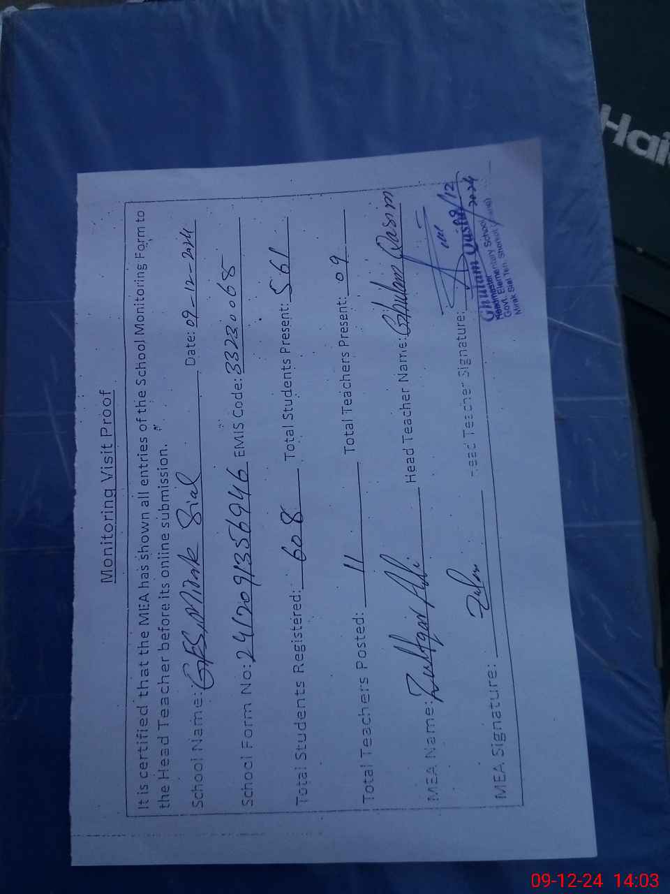 | Certified that this School was Inspected by the Undersigned MEA/DMO Today and the Information Stated Above is as Per Record. | |||||