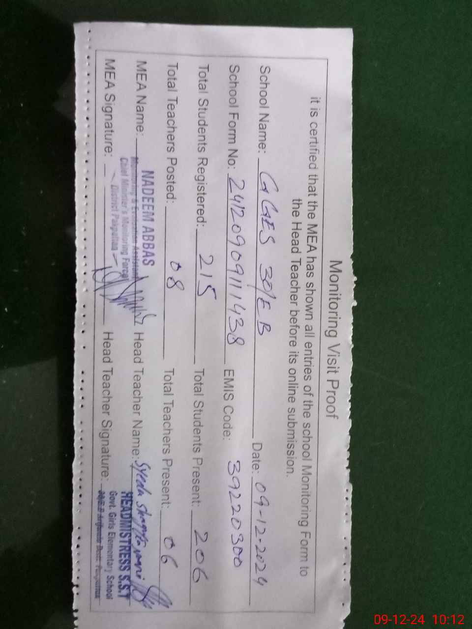 | Certified that this School was Inspected by the Undersigned MEA/DMO Today and the Information Stated Above is as Per Record. | |||||