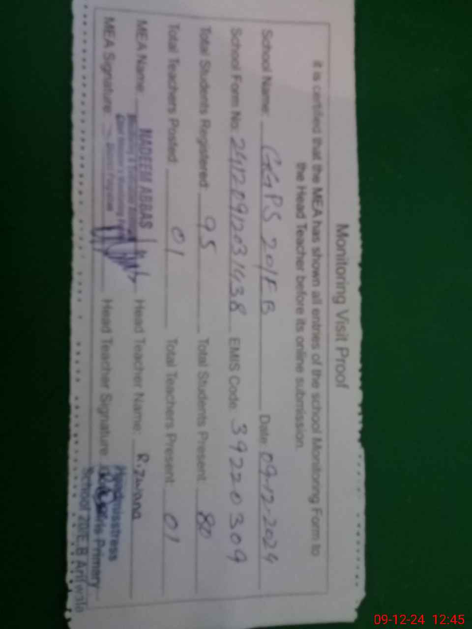 | Attendance Register | Head Teacher | MEA with School | Visit Proof |
