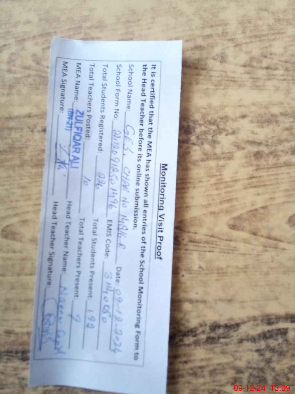 | Attendance Register | Head Teacher | MEA with School | Visit Proof |
