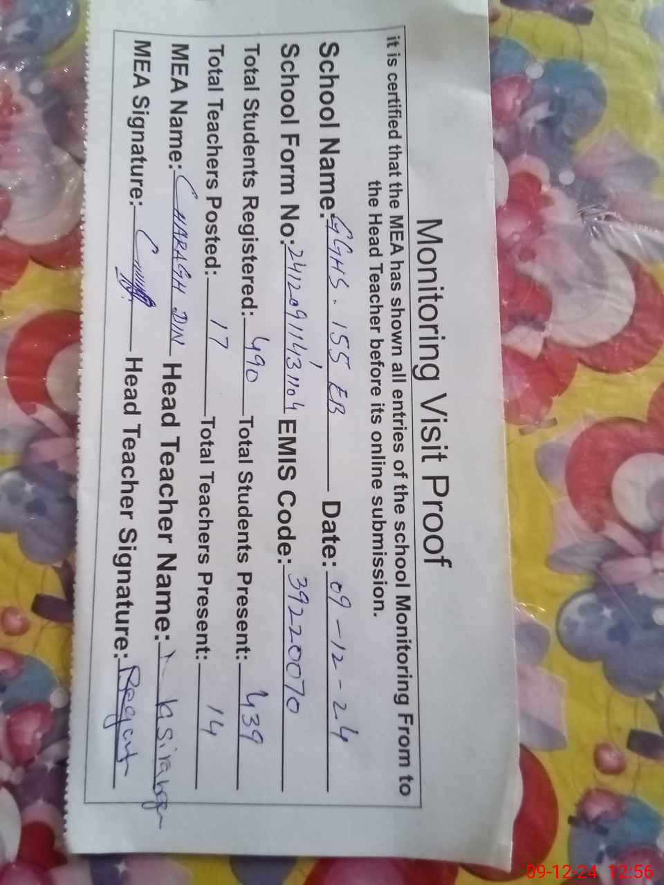 | Attendance Register | Head Teacher | MEA with School | Visit Proof |