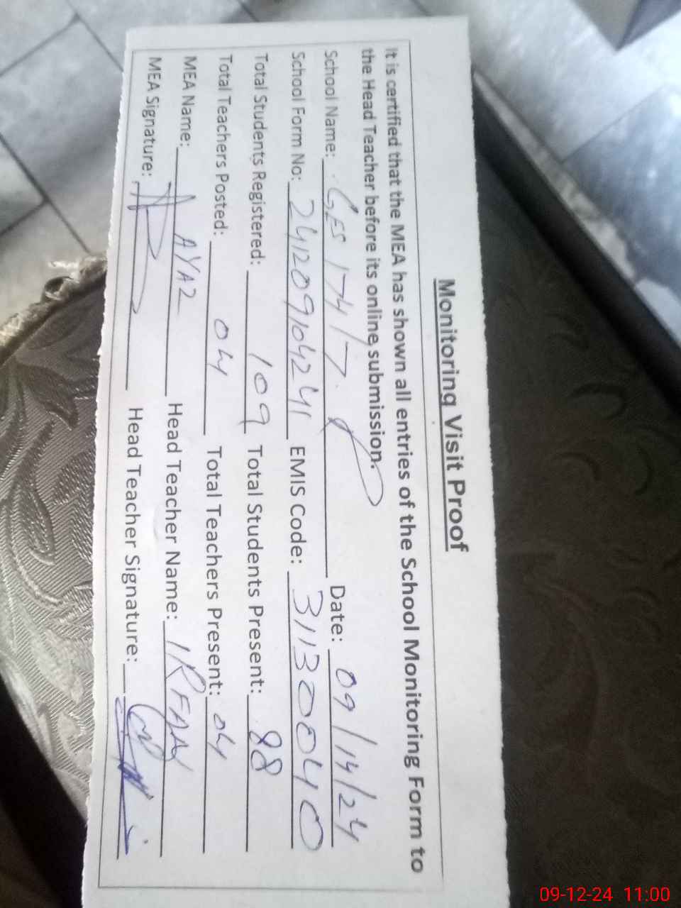 | Attendance Register | Head Teacher | MEA with School | Visit Proof |