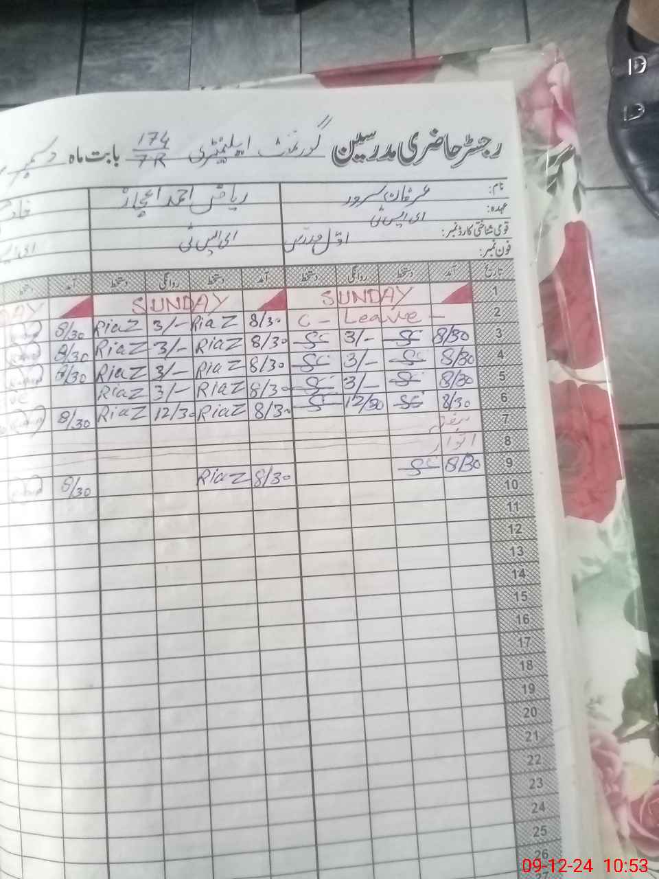 | CNIC | Full Name | Designation | R/C | Absence During Last Calender Month |