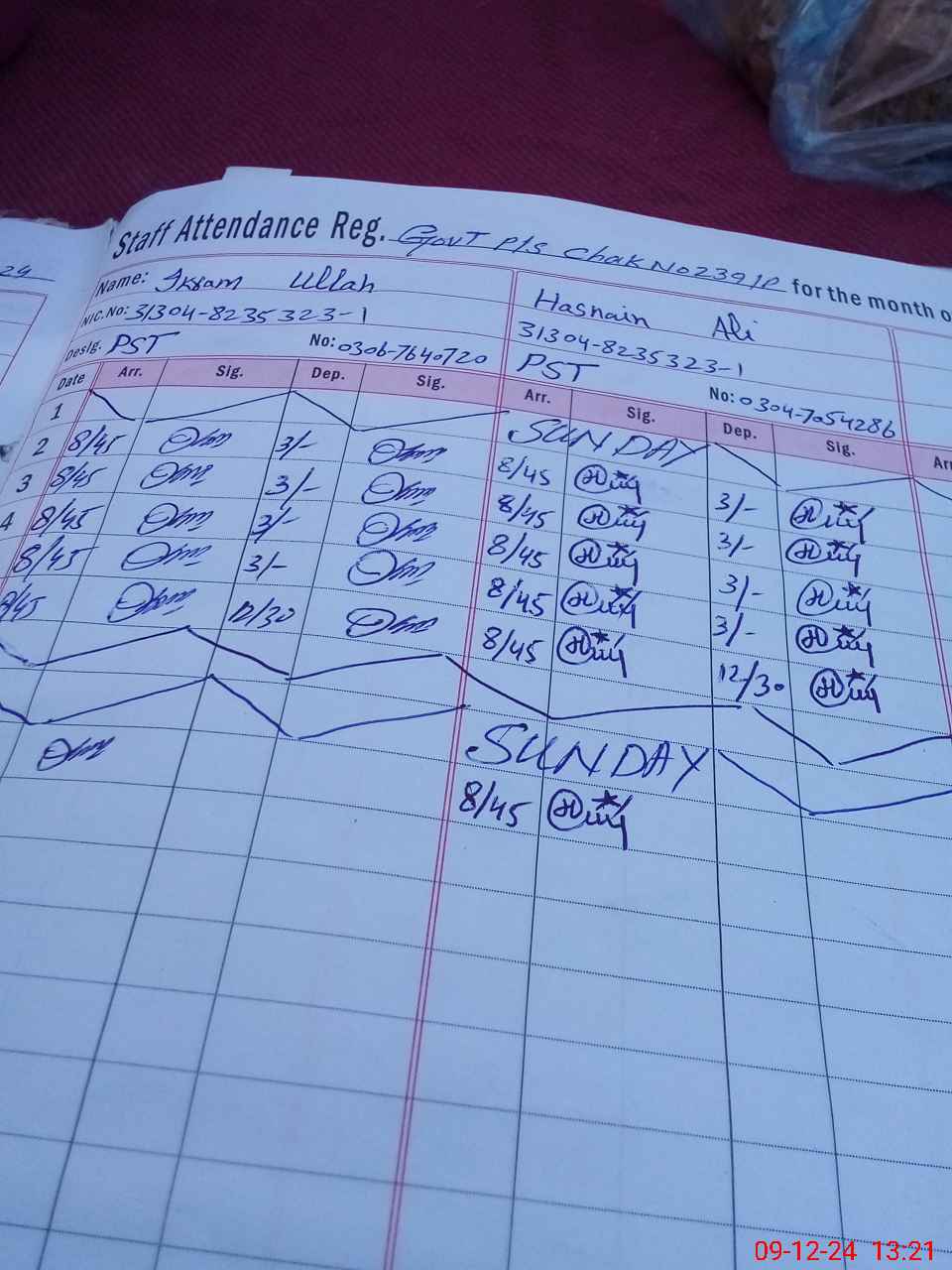 | CNIC | Full Name | Designation | R/C | Absence During Last Calender Month |