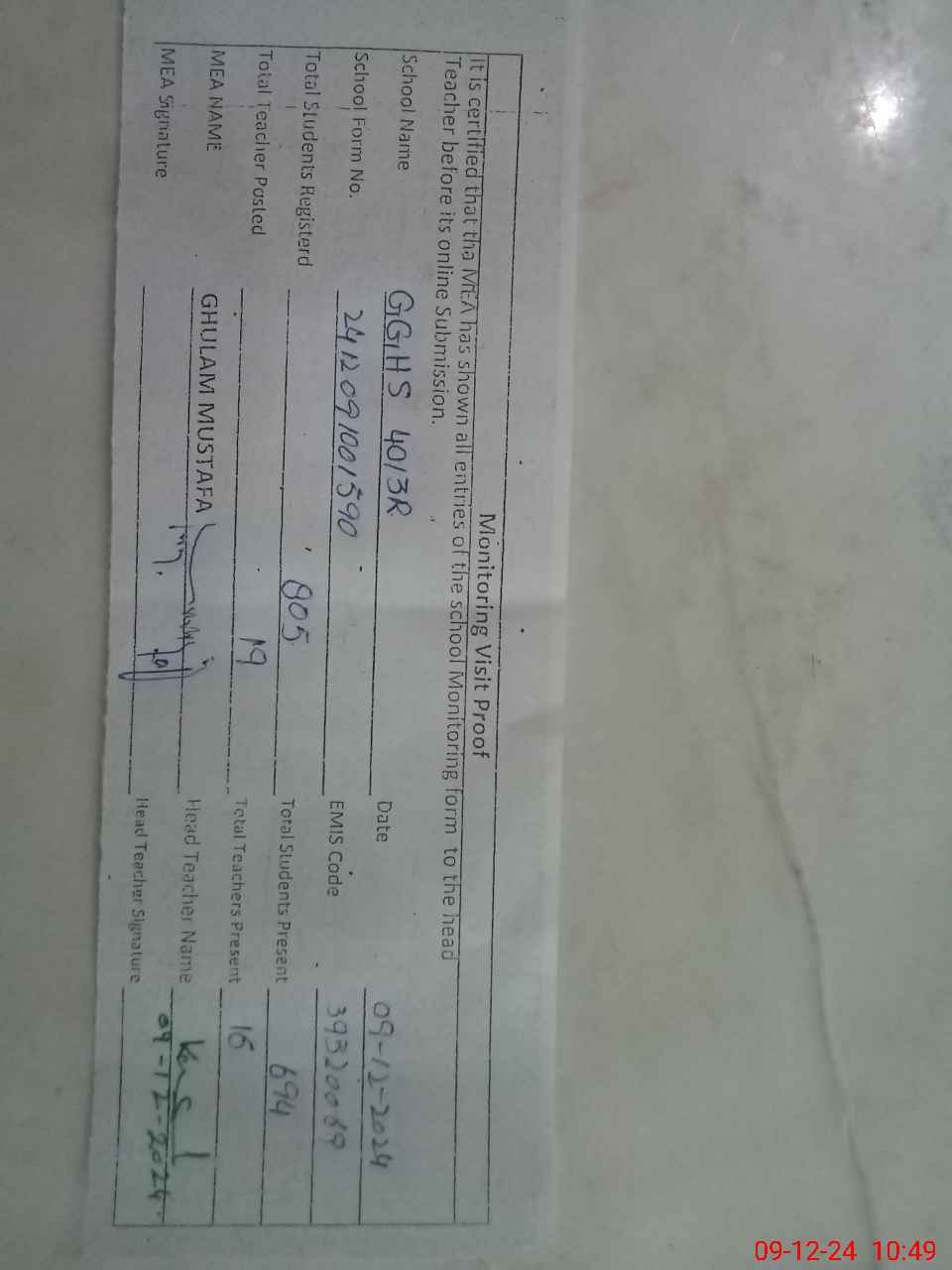 | Certified that this School was Inspected by the Undersigned MEA/DMO Today and the Information Stated Above is as Per Record. | |||||