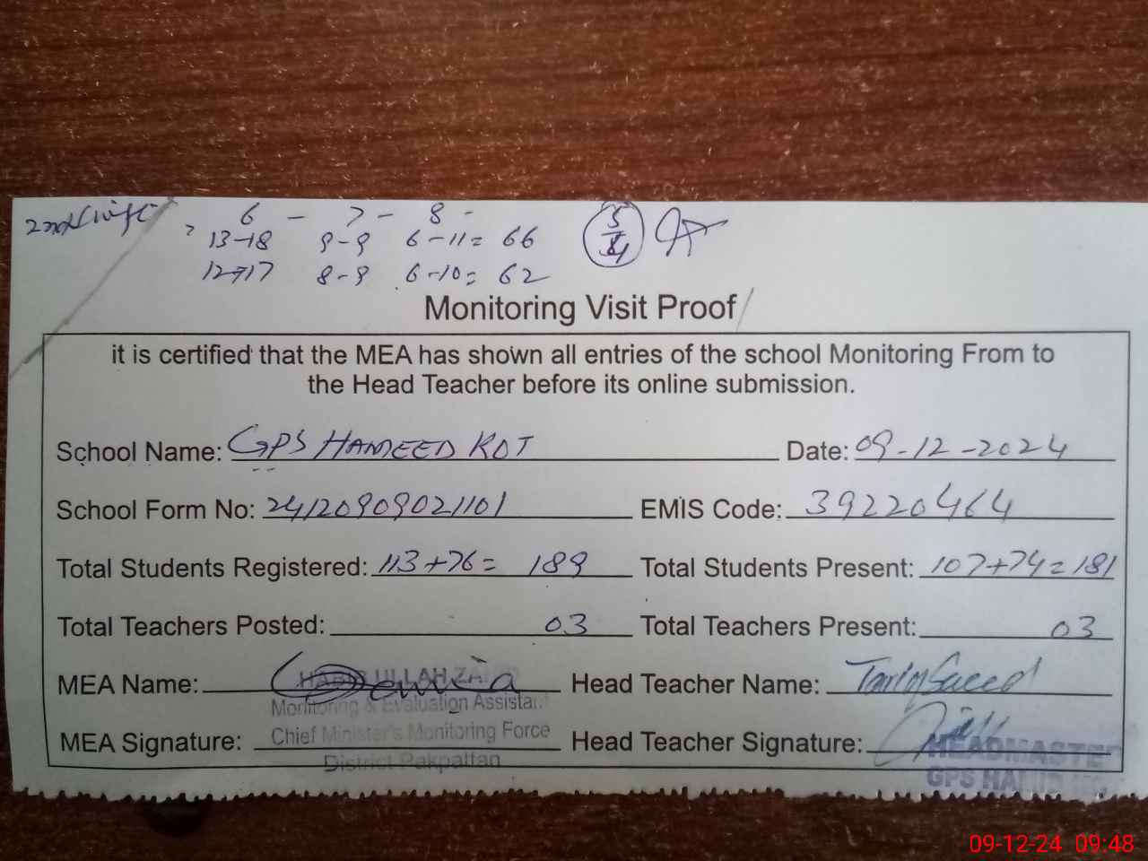 | EMIS Code: 39220464 | Name of School: GPS HAMEED KOT (MEHMOOD KOT) | |||