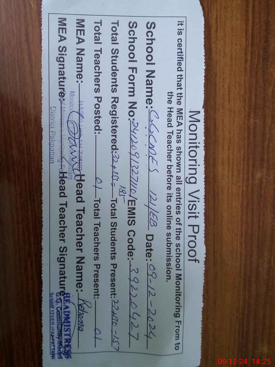 | Attendance Register | Head Teacher | MEA with School | Visit Proof |