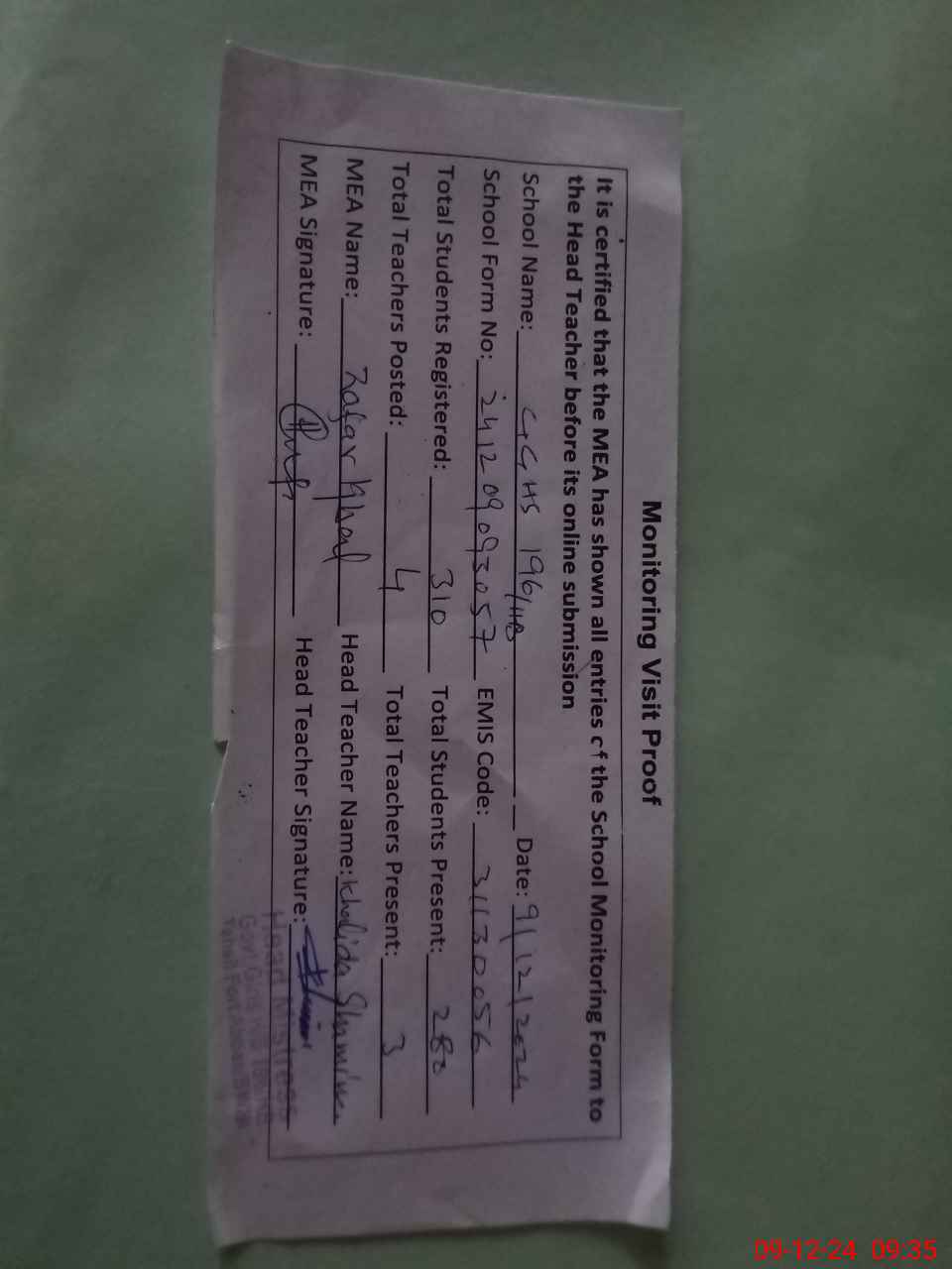 | Attendance Register | Head Teacher | MEA with School | Visit Proof |