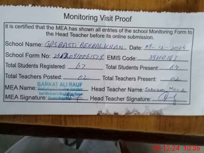 | EMIS Code: 39210183 | Name of School: GPS BASTI BEHBAL KHAN PAKPATTAN | |||