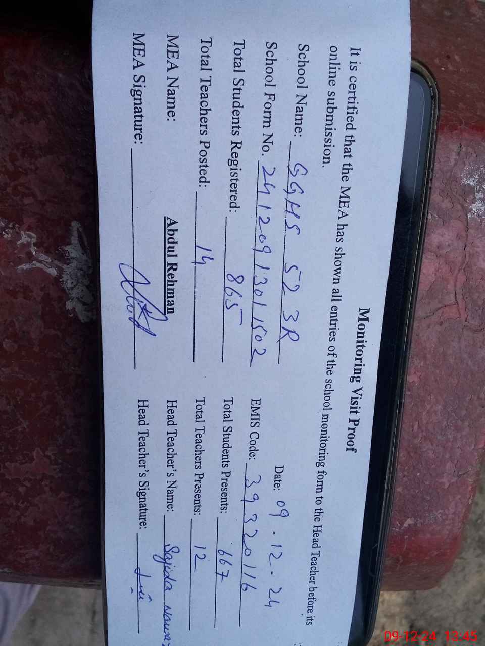 | Attendance Register | Head Teacher | MEA with School | Visit Proof |