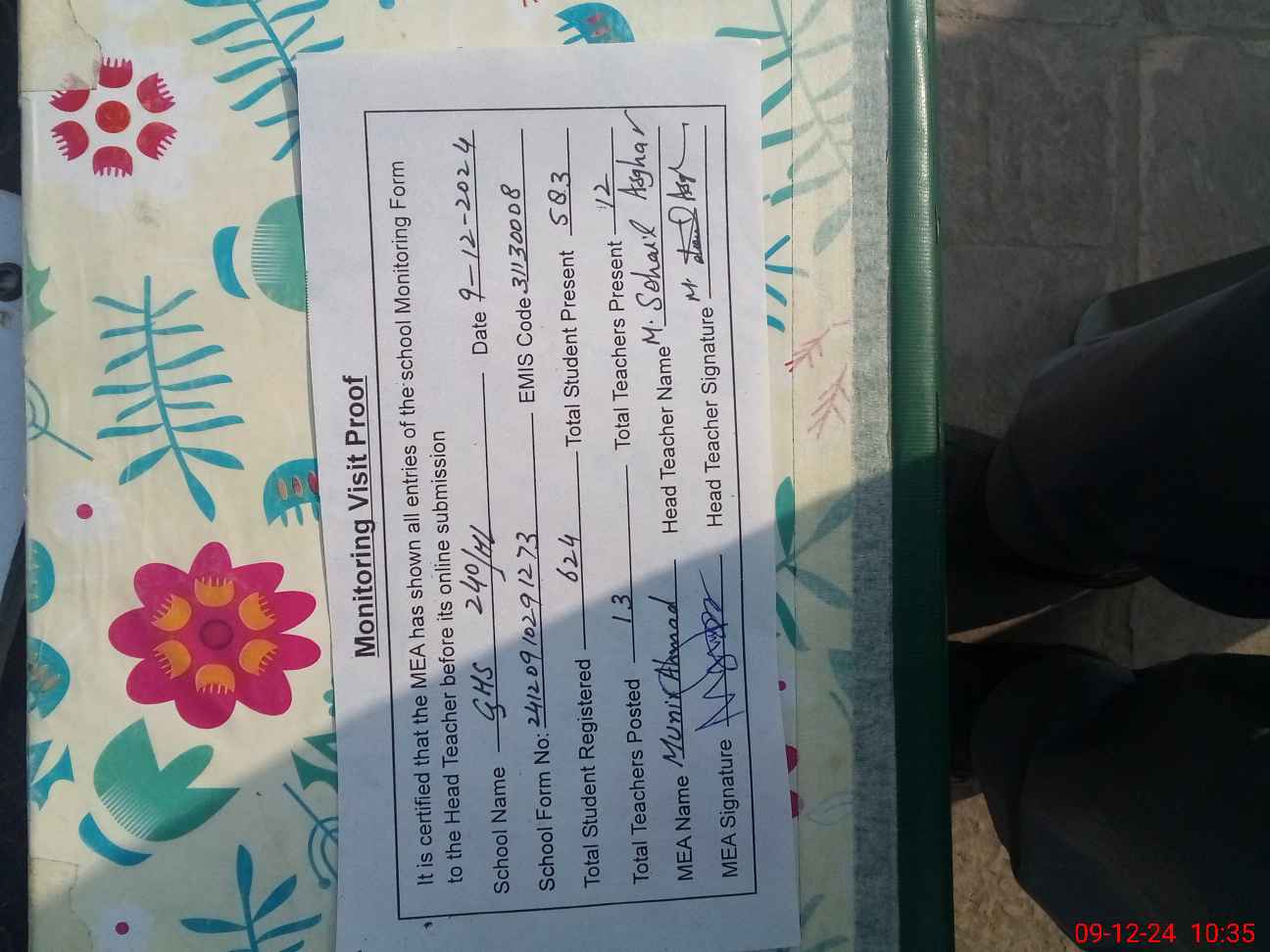| Name: A.**** Designation: (School Headmaster's/Headmistress's) SST Phone/Cell Number: 03**** |
