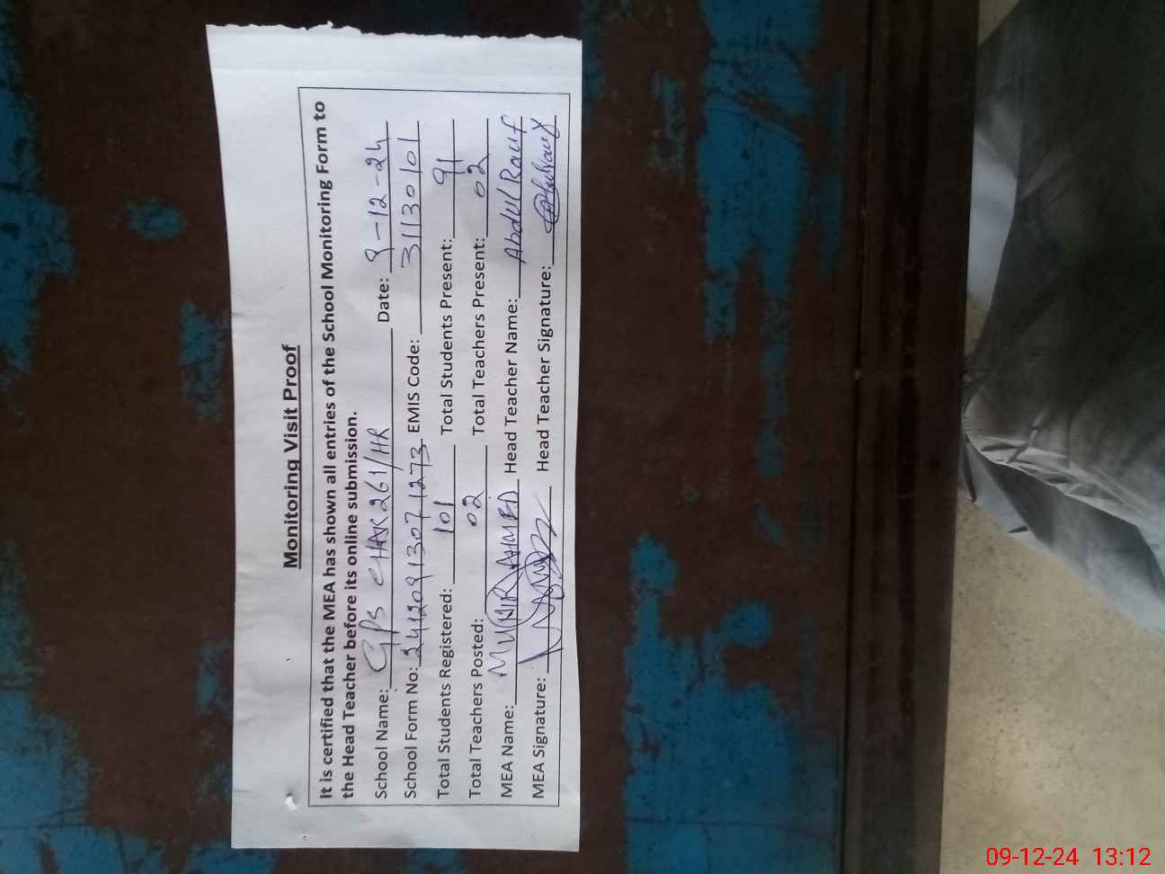 | Attendance Register | Head Teacher | MEA with School | Visit Proof |