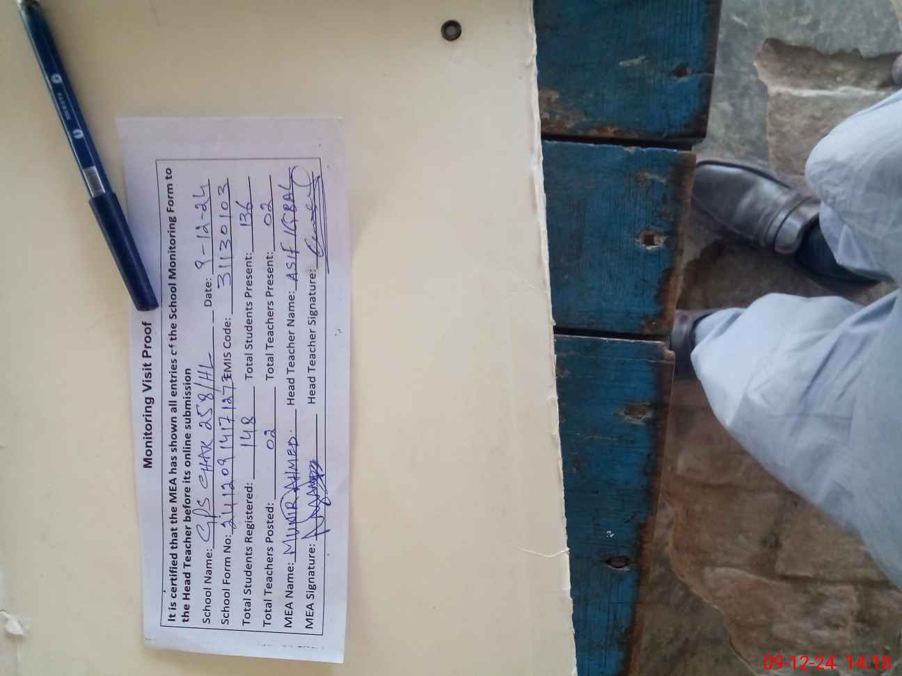 | Attendance Register | Head Teacher | MEA with School | Visit Proof |