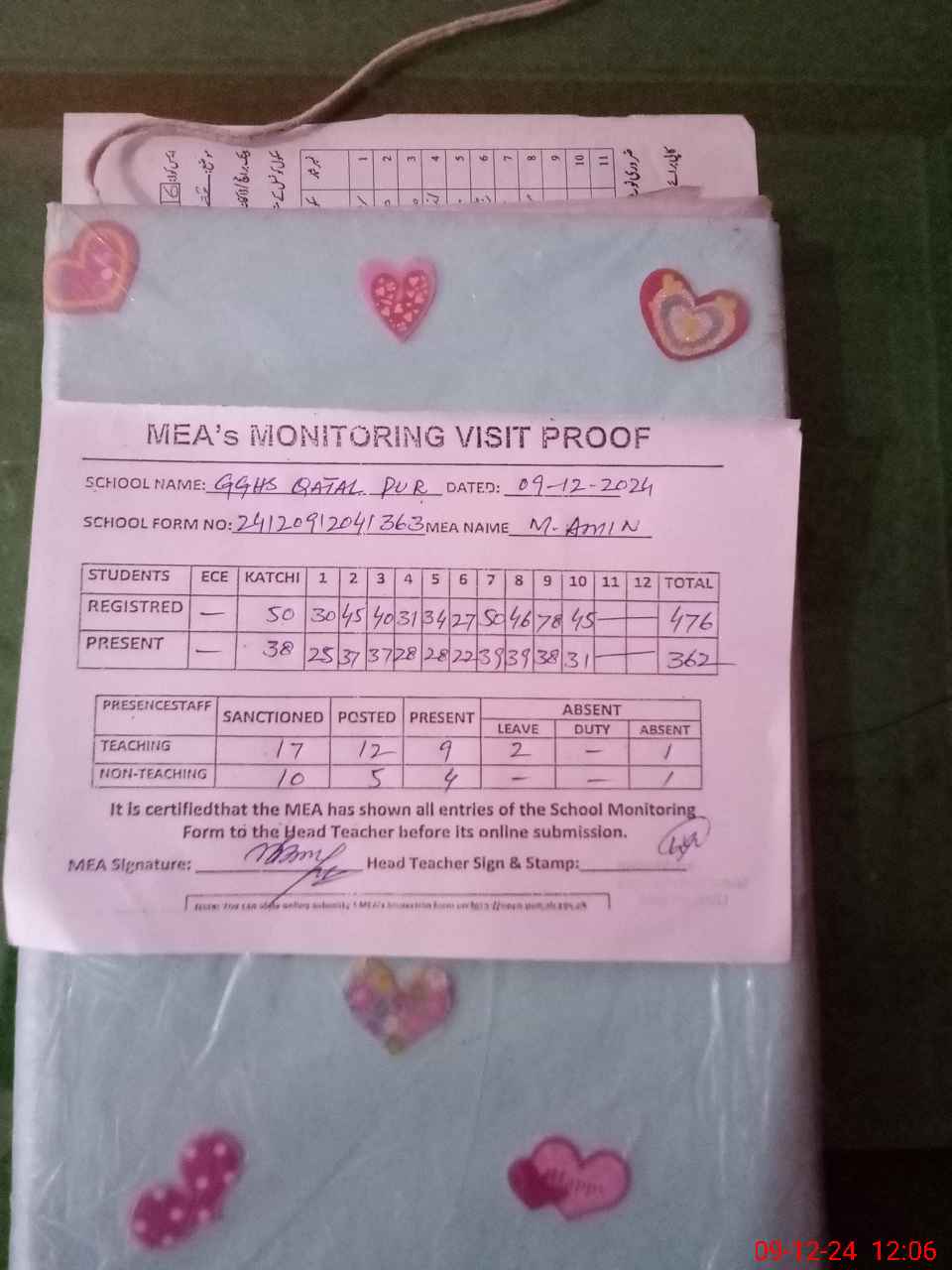 | Attendance Register | Head Teacher | MEA with School | Visit Proof |