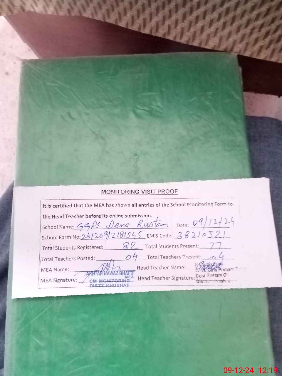 | Attendance Register | Head Teacher | MEA with School | Visit Proof |
