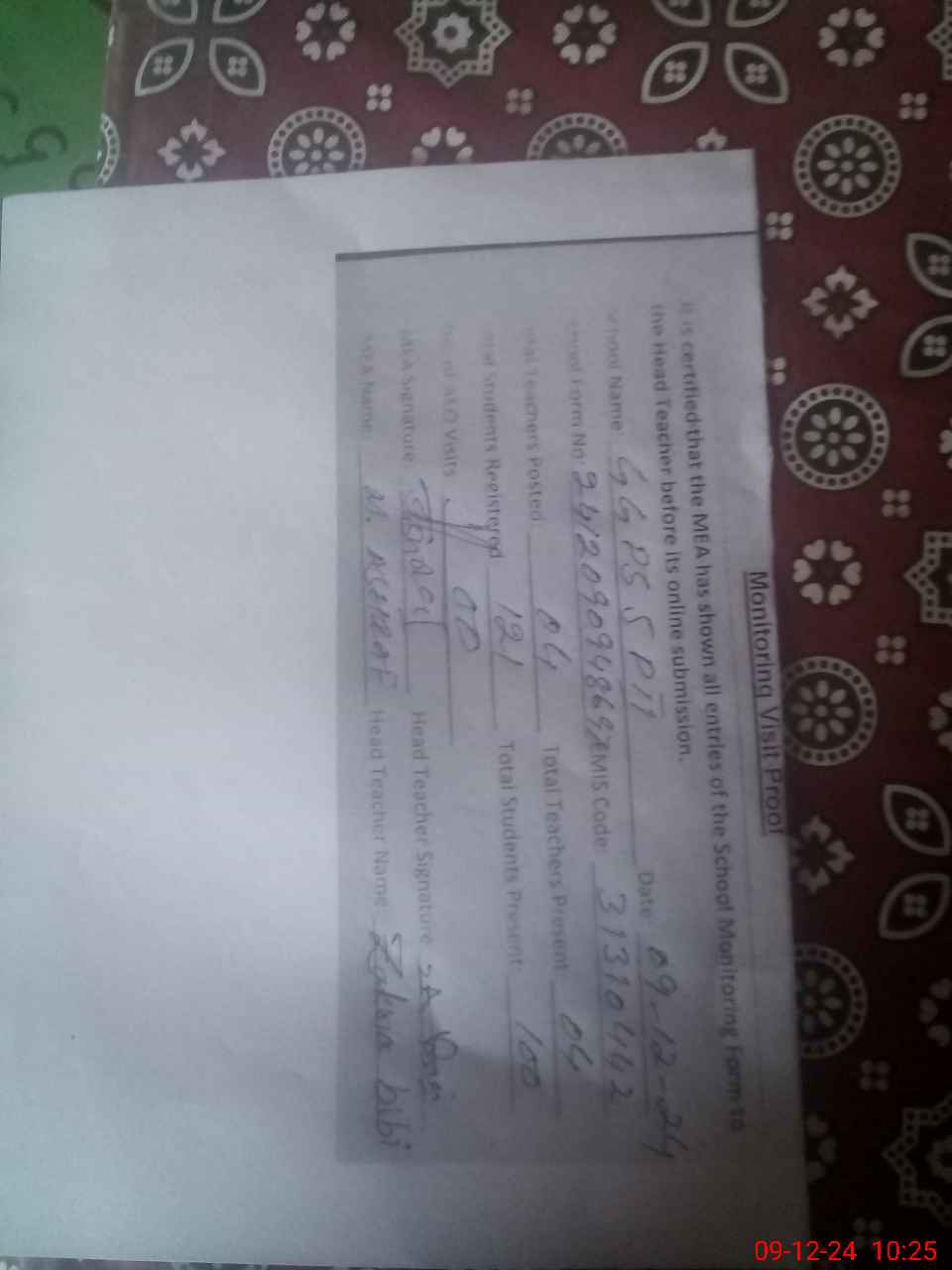 | Attendance Register | Head Teacher | MEA with School | Visit Proof |