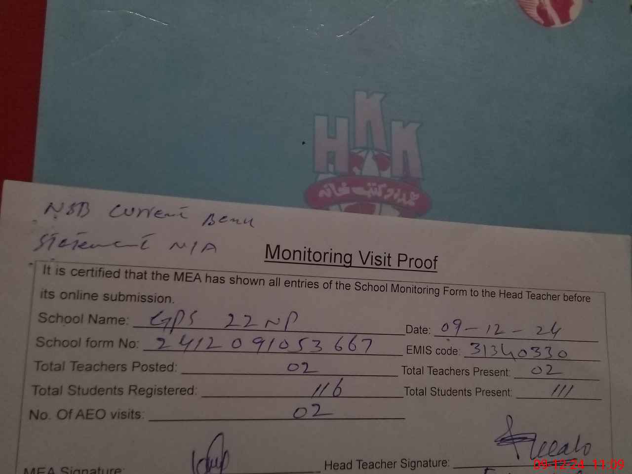 | Attendance Register | Head Teacher | MEA with School | Visit Proof |