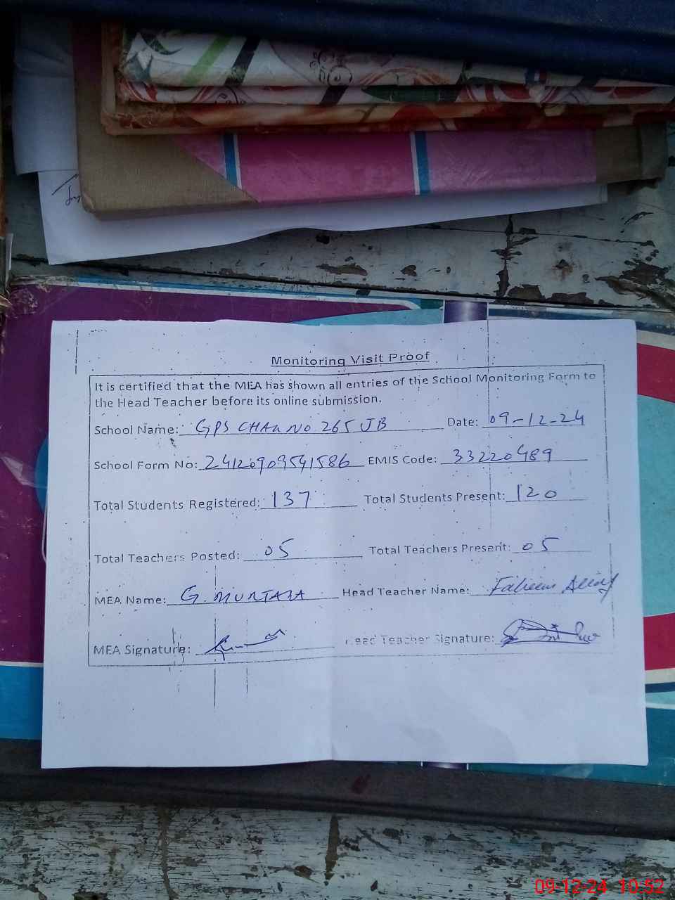 | EMIS Code: 33220489 | Name of School: GPS CHAK NO 265 JB | |||