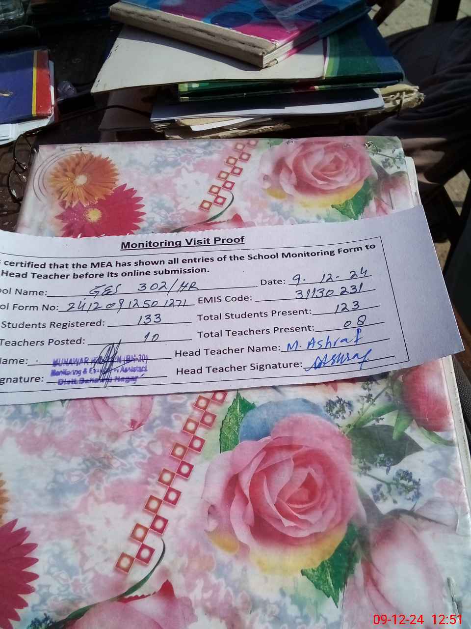 | Attendance Register | Head Teacher | MEA with School | Visit Proof |