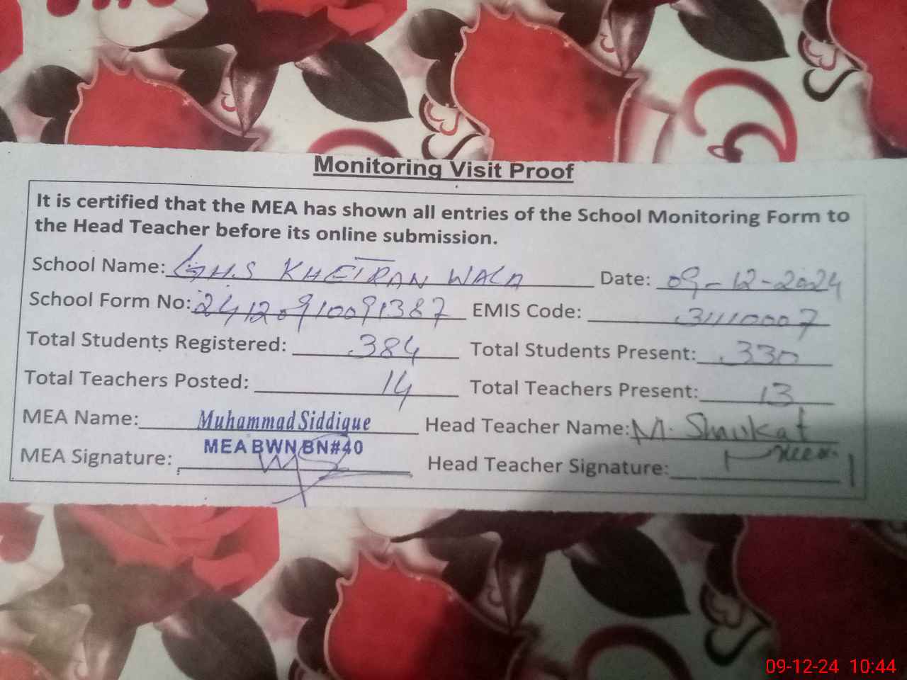 | Certified that this School was Inspected by the Undersigned MEA/DMO Today and the Information Stated Above is as Per Record. | |||||