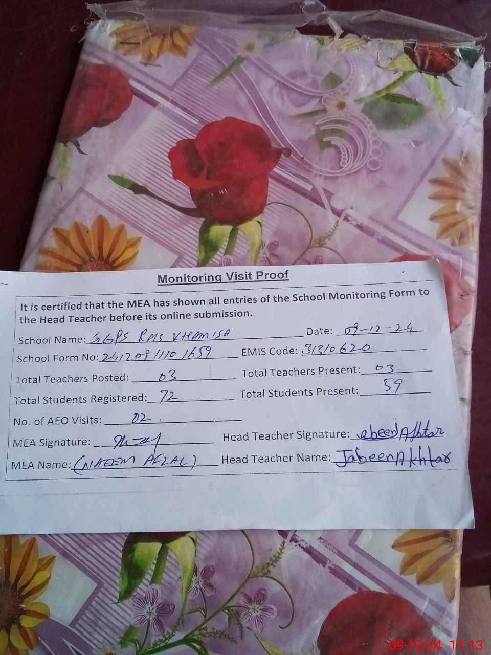 | Attendance Register | Head Teacher | MEA with School | Visit Proof |