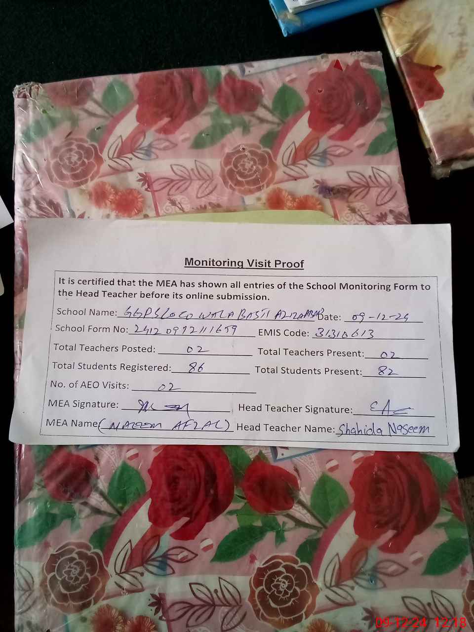 | Attendance Register | Head Teacher | MEA with School | Visit Proof |