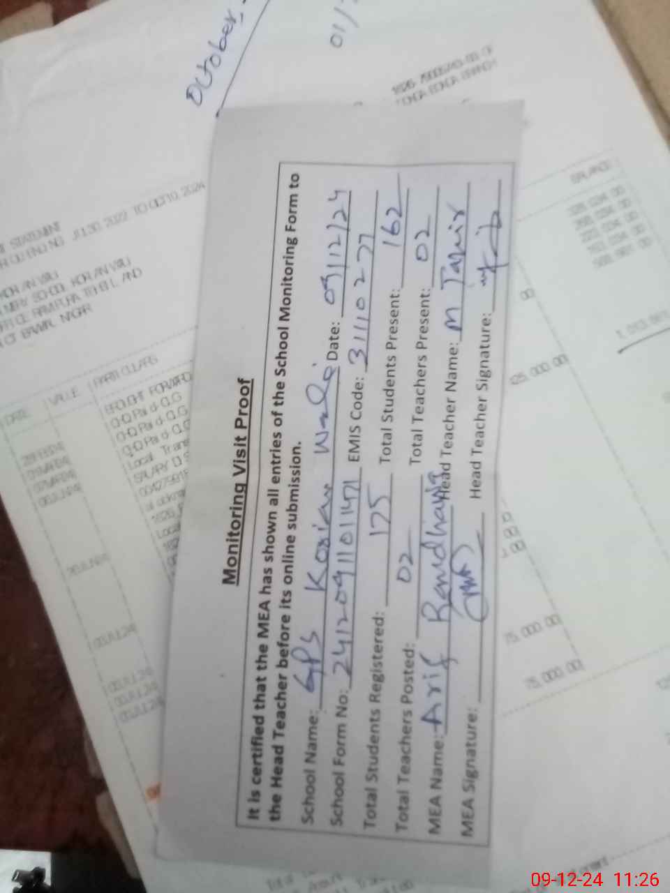 | Attendance Register | Head Teacher | MEA with School | Visit Proof |