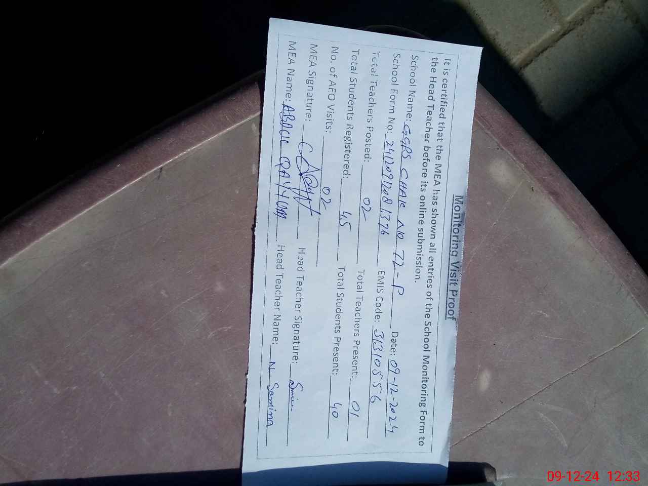 | Attendance Register | Head Teacher | MEA with School | Visit Proof |