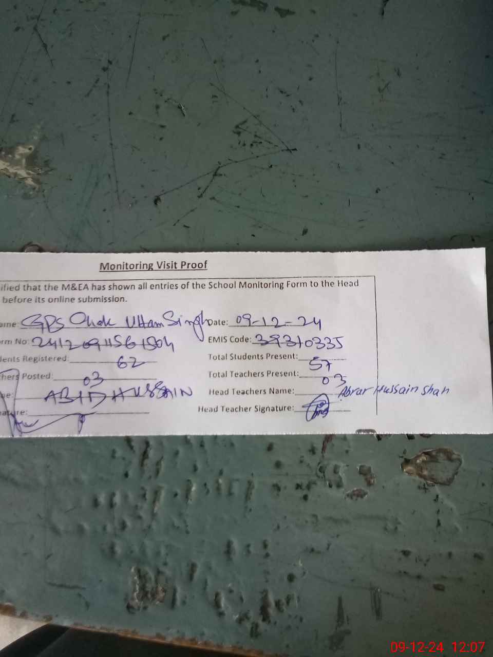 | Attendance Register | Head Teacher | MEA with School | Visit Proof |