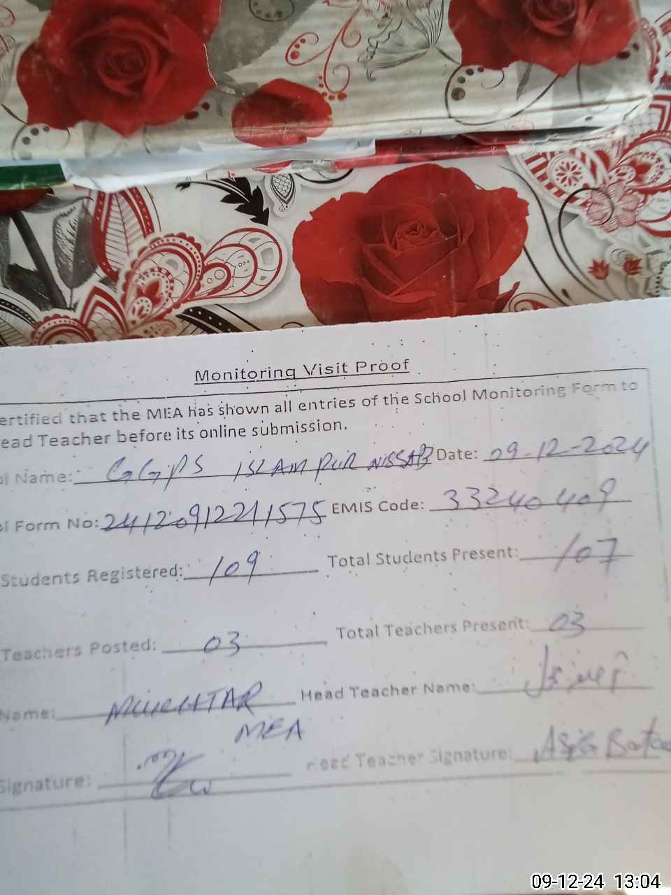 | Attendance Register | Head Teacher | MEA with School | Visit Proof |