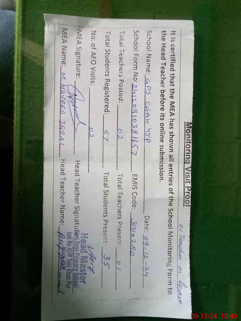 | Attendance Register | Head Teacher | MEA with School | Visit Proof |