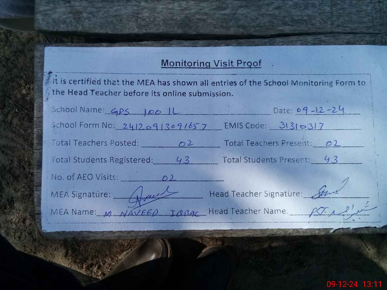 | EMIS Code: 31310317 | Name of School: GPS CHAK NO. 100/1-L | |||