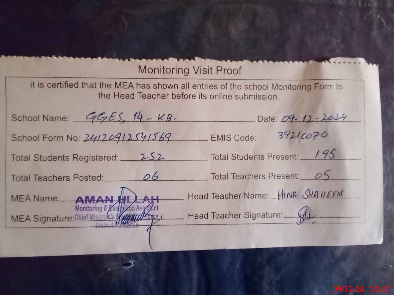 | Attendance Register | Head Teacher | MEA with School | Visit Proof |