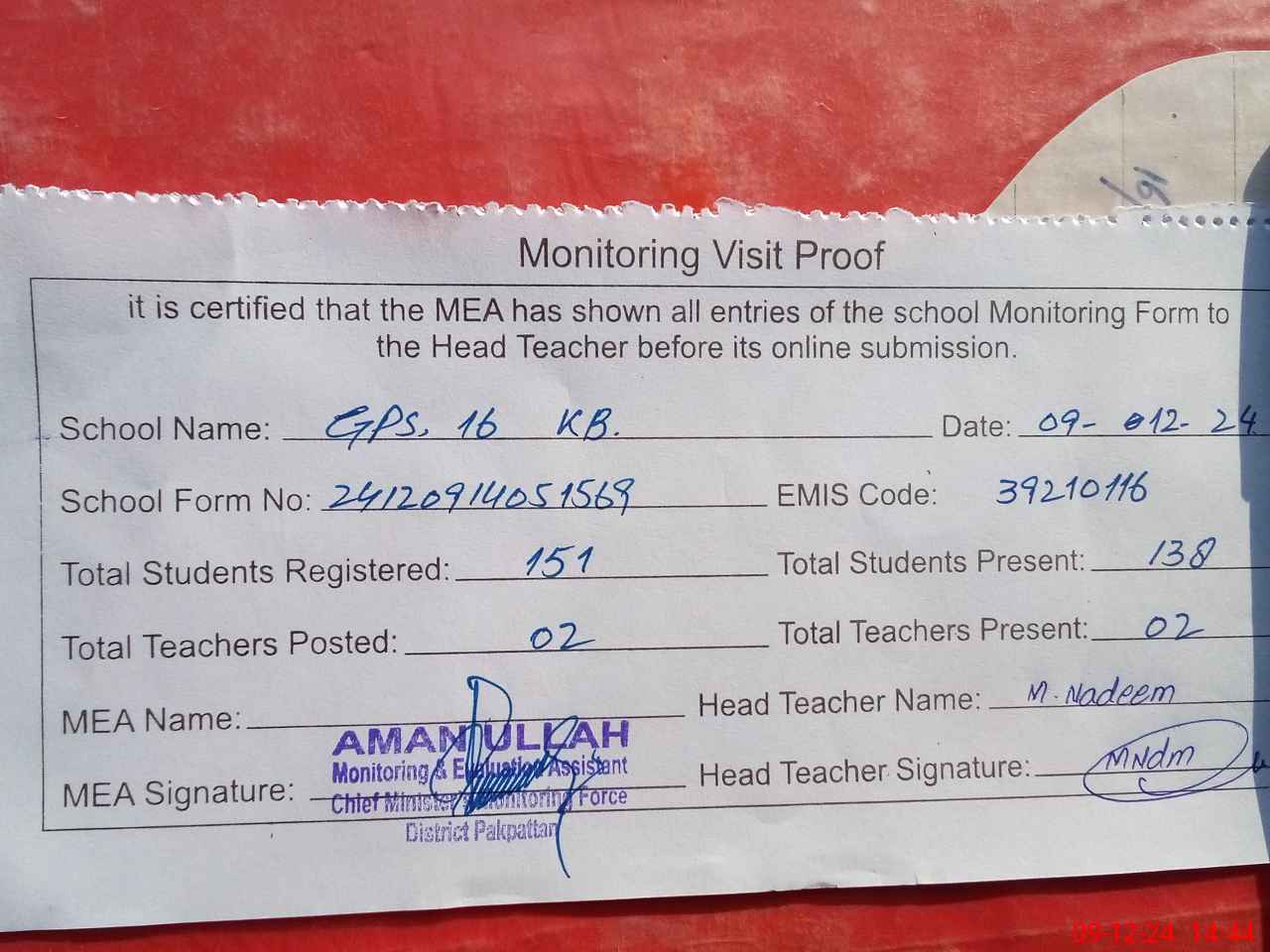 | Attendance Register | Head Teacher | MEA with School | Visit Proof |